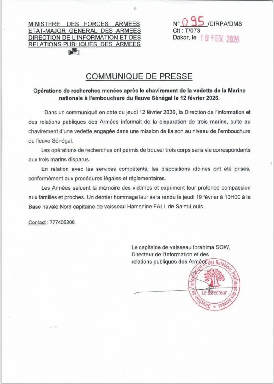 أعلنت مديرية الإعلام والعلاقات العامة للقوات المسلحة السنغالية، في بيان صحفي، العثور على جثث ثلاثة بحارة تابعين للبحرية الوطنية، كانوا قد فُقدوا إثر انقلاب زورق دورية أثناء تنفيذ مهمة اتصال عند مصب نهر السنغال.