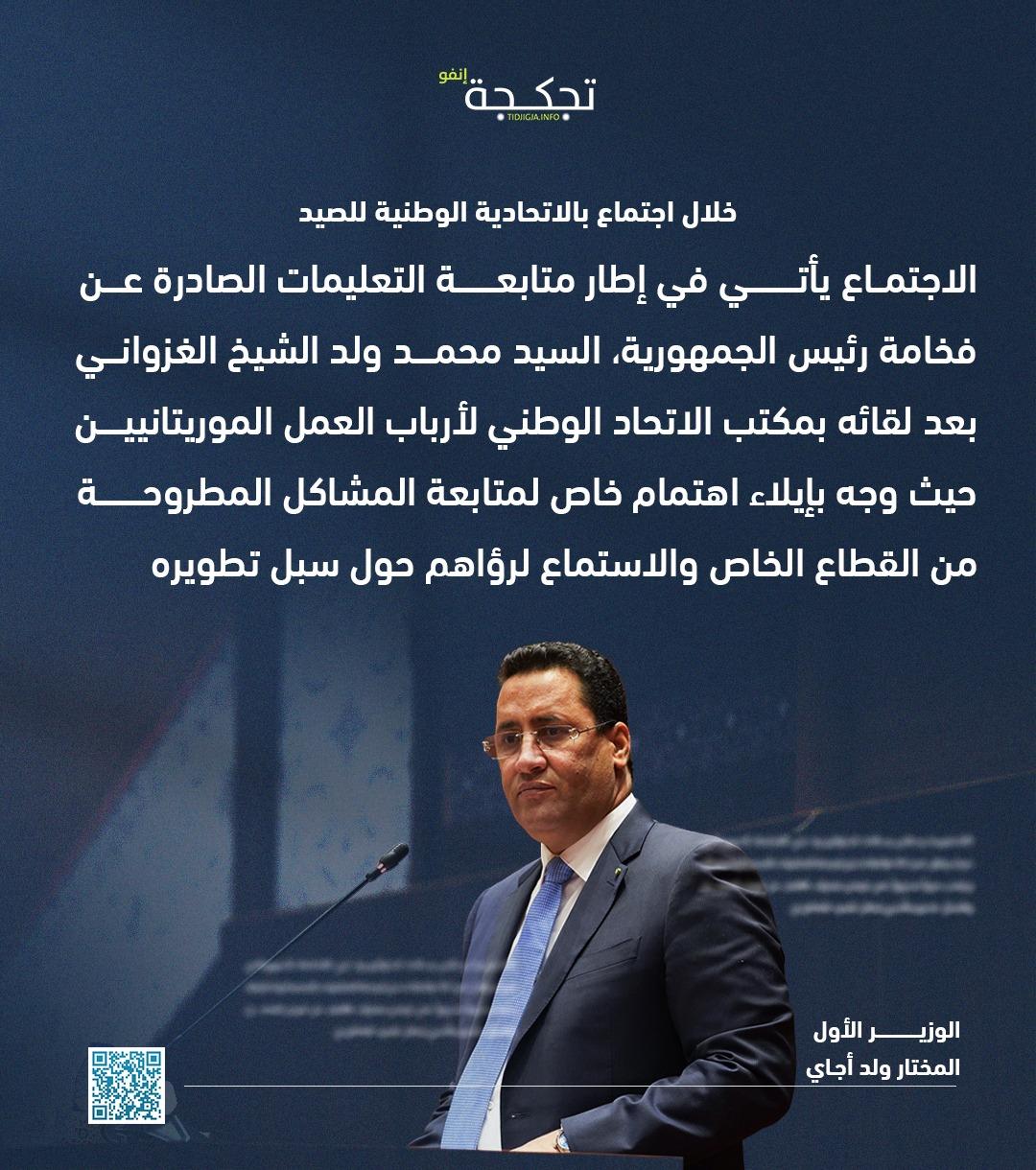 وأوضح الوزير الأول، خلال لقائه ممثلي الاتحادية الوطنية للصيد، أن هذا الاجتماع يأتي متابعةً لمخرجات اللقاء الذي جمع رئيس الجمهورية بمكتب الاتحاد الوطني لأرباب العمل الموريتانيين، حيث وجّه بإيلاء عناية خاصة للمشاكل المطروحة من طرف الفاعلين الاقتصاديين، والاستماع إلى رؤاهم ومقترحاتهم بشأن تطوير القطاع الخاص ودعم دوره في التنمية الاقتصادية.