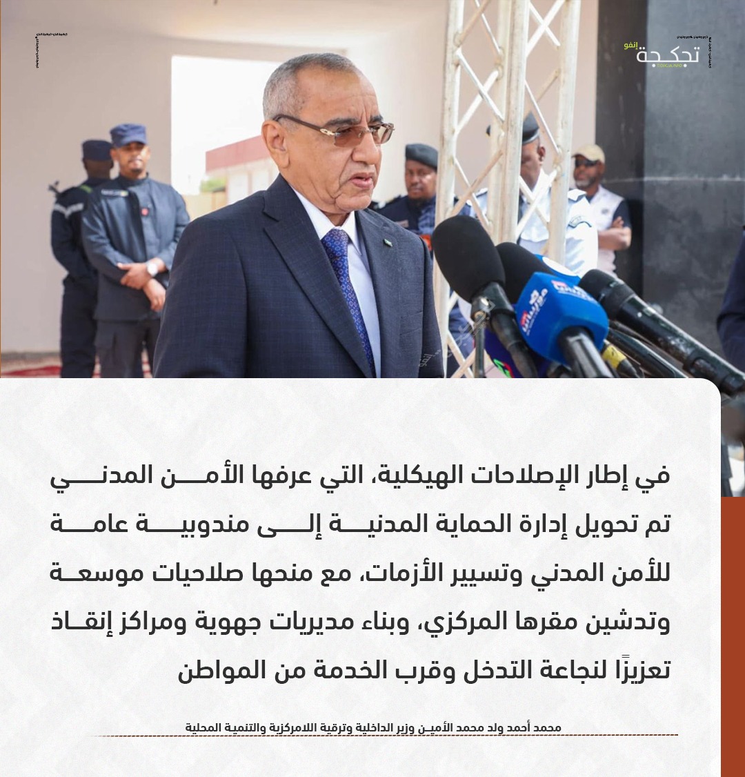 قال وزير الداخلية وترقية اللامركزية والتنمية المحلية، محمد أحمد ولد محمد الأمين، إنه تم تحويل إدارة الحماية المدنية إلى مندوبية عامة للأمن المدني وتسيير الأزمات صمن إطار الإصلاحات الهيكلية، التي عرفها الأمن المدني.