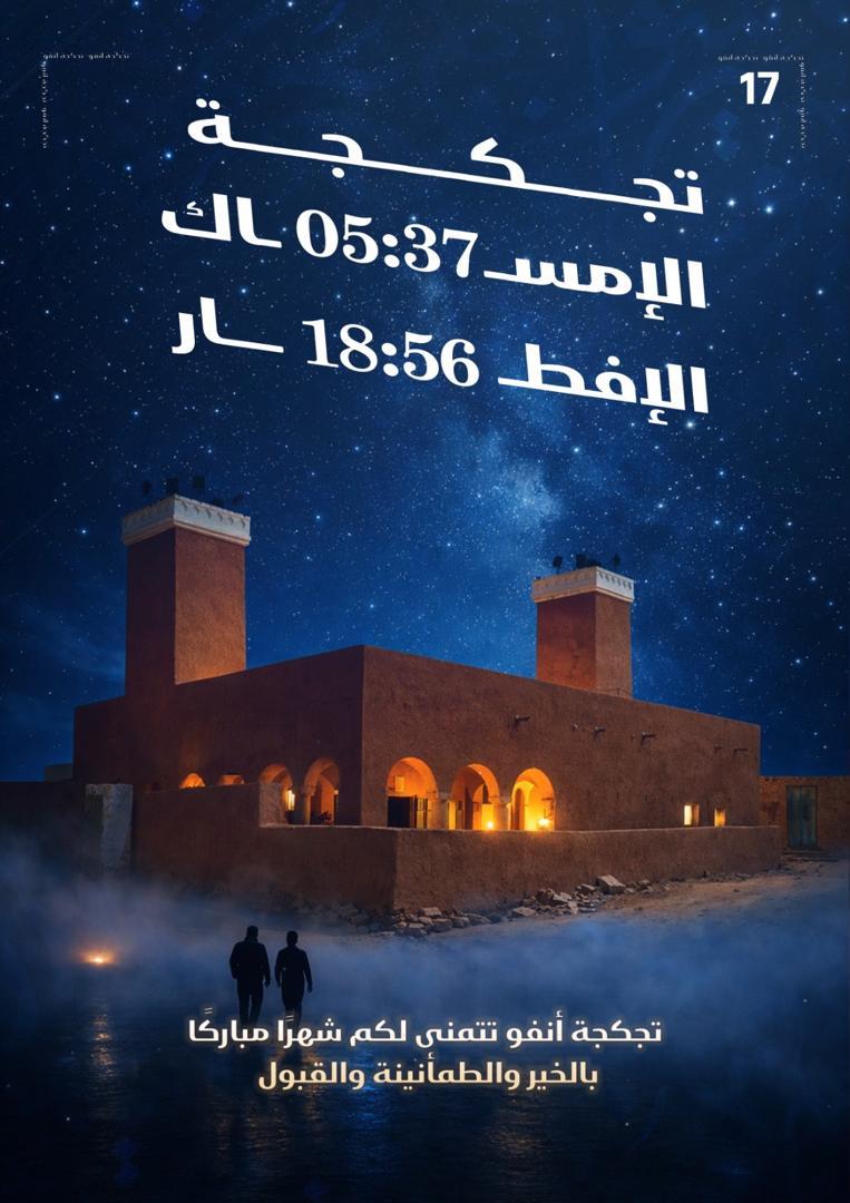 أظهرت الإمساكية الرسمية التي نشرتها وزارة الشؤون الإسلامية والتعليم الأصلي أن موعد الإمساك في الـ17 من أيام شهر رمضان المبارك بمدينة تجكجه سيكون عند الساعة 05:37 صباحا.