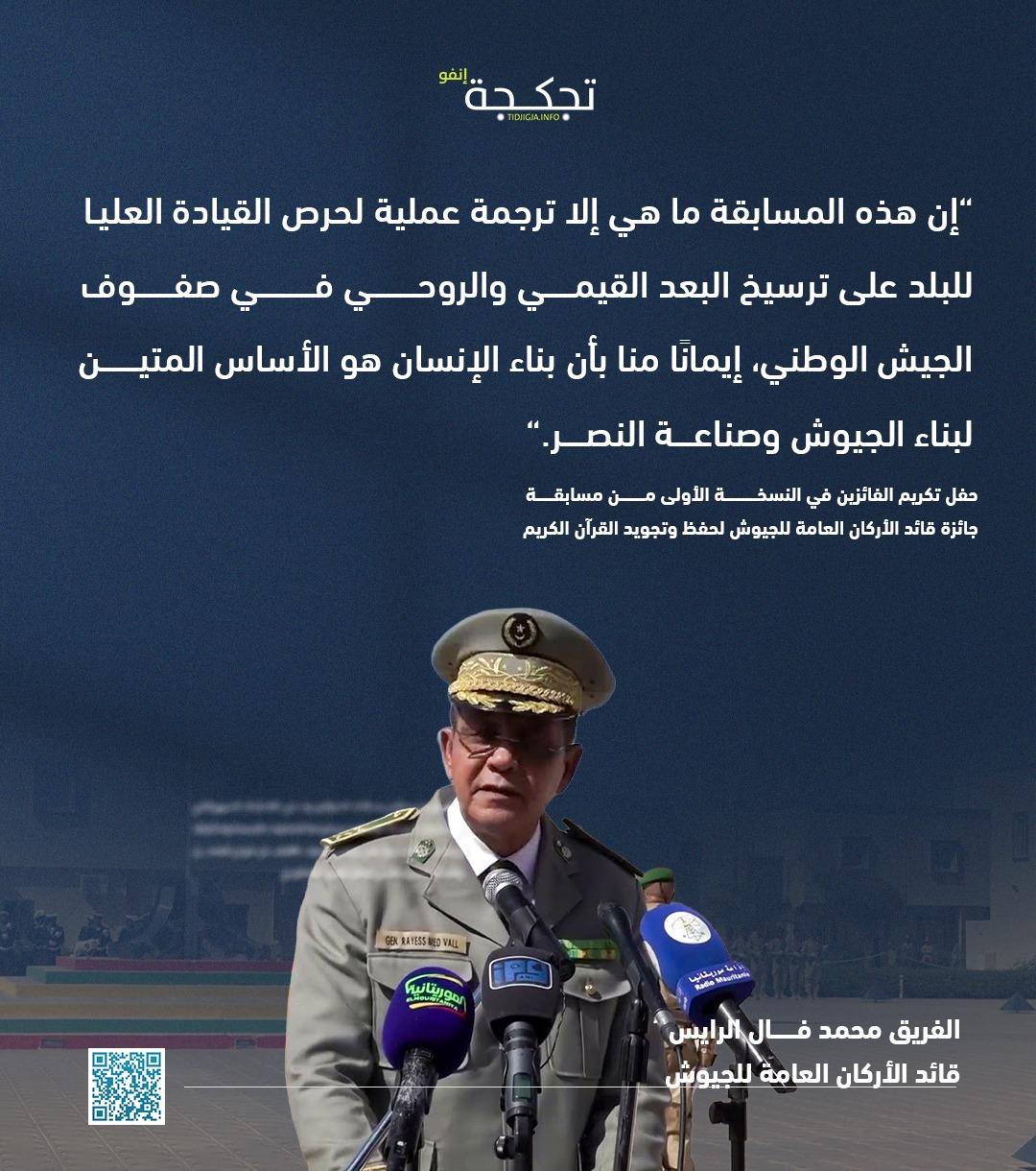 قال الفريق محمد فال الرايس الرايس، قائد الأركان العامة للجيوش، إن مسابقة "جائزة قائد الأركان العامة للجيوش لحفظ وتجويد القرآن الكريم" ما هي إلا ترجمة عملية لحرص القيادة العليا للبلد على ترسيخ البعد القيمي والروحي في صفوف الجيش الوطني، إيمانًا منا بأن بناء الإنسان هو الأساس المتين لبناء الجيوش وصناعة النصر.“