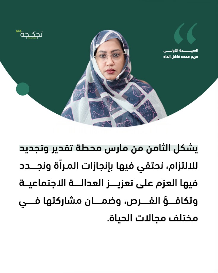 قالت السيدة الأولى، مريم محمد فاضل الداه، إن الثامن من مارس، اليوم الدولي للمرأة، يشكل محطة تقدير وتجديد للالتزام، يُحتفى فيها بإنجازات المرأة.