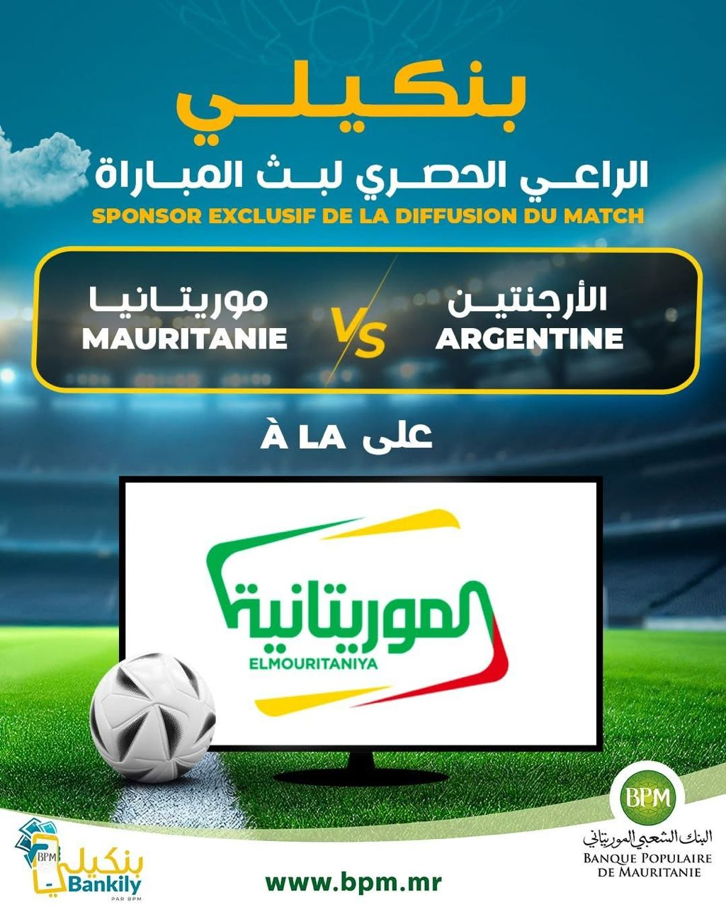 كشفت قناة الموريتانية عن نقلها الحصري للمباراة المرتقبة التي ستجمع بين المنتخب الوطني"المرابطون" ونظيره الأرجنتيني، وذلك برعاية رسمية من تطبيق “بنكيلي” (Bankily) التابع للبنك الشعبي الموريتاني.