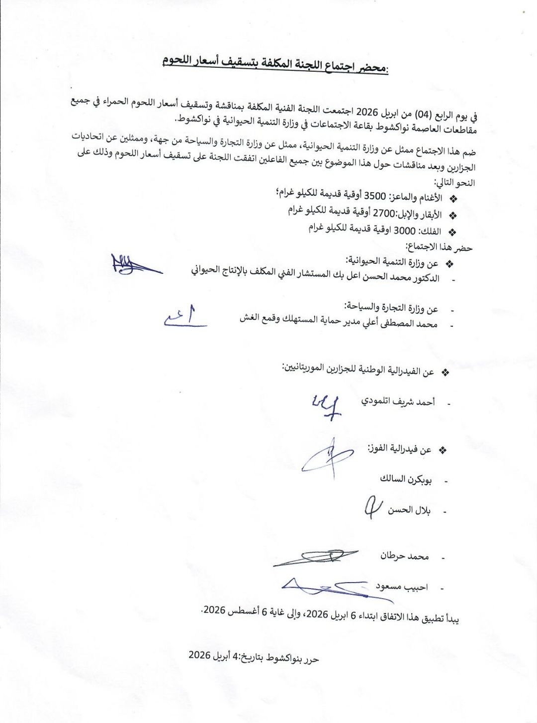 أعلنت الحكومة الموريتانية عبر وزارة التجارة والسياحة، التوصل إلى اتفاق مع اتحاديات الجزارين يقضي بتسقيف أسعار اللحوم الحمراء، وذلك خلال اجتماع احتضنته مباني وزارة التنمية الحيوانية في العاصمة نواكشوط.
