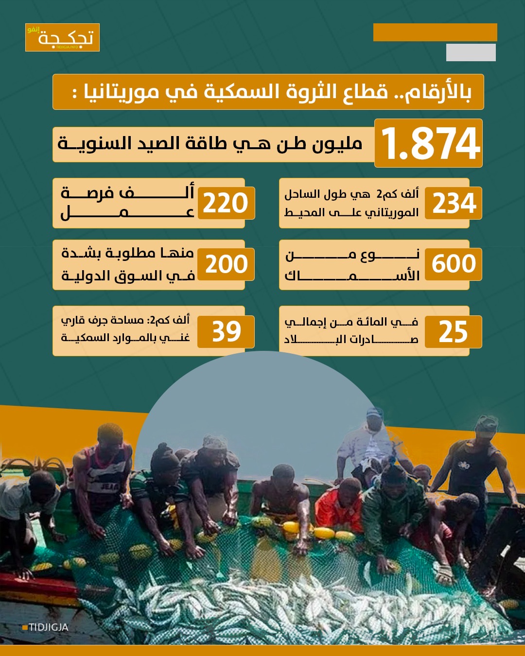 يساهم قطاع الثروة السمكية بـ 25 في المائة من إجمالي صادرات موريتانيا، كما يوفر أكثر من 220 ألف فرصة عمل.