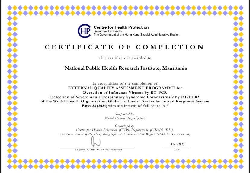 حصل المعهد الوطني للبحوث في مجال الصحة العمومية، على شهادة إتمام دولية من مركز الحماية الصحية التابع لحكومة منطقة هونغ كونغ، وذلك بعد إكماله بنجاح برنامج التقييم الخارجي للجودة للعام 2024، بدعم من منظمة الصحة العالمية.