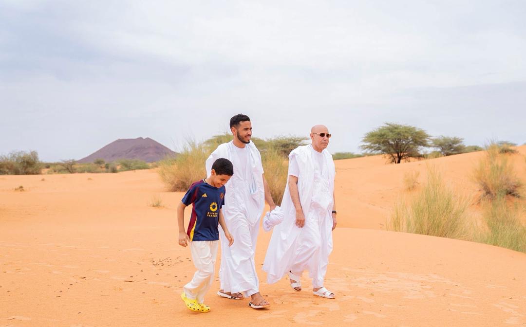 ويظهر في إحدى الصور الرئيس غزواني وهو يسير رفقة بعض أفراد أسرته، ويظهر في الأخرى وهو يسير وحيداً.
