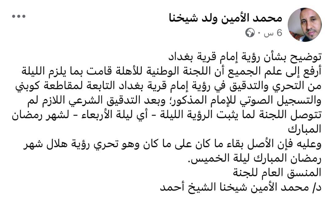 قال المنسق العام للجنة الوطنية للأهلة، الدكتور محمد الأمين شيخنا الشيخ أحمد، أن اللجنة قامت خلال الليلة البارحة بكافة إجراءات التحري والتدقيق اللازمة، بما في ذلك الاستماع إلى التسجيل الصوتي لإمام قرية بغداد بمقاطعة كوبني، وإخضاع المعطيات للتحقيق الشرعي المعتمد.